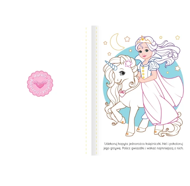 Obrazki można oderwać, a następnie ozdobić, pokolorować według instrukcji lub własnego pomysłu oraz wykonać proste zadania na przeliczanie i spostrzegawczość. Lubiana przez dzieci tematyka rysunków i proste zadania aktywizujące zachęcą dzieci do kolorowania. Pokoloruj, udekoruj, wskaż i policz – baw się brylancikami z księżniczkami.
