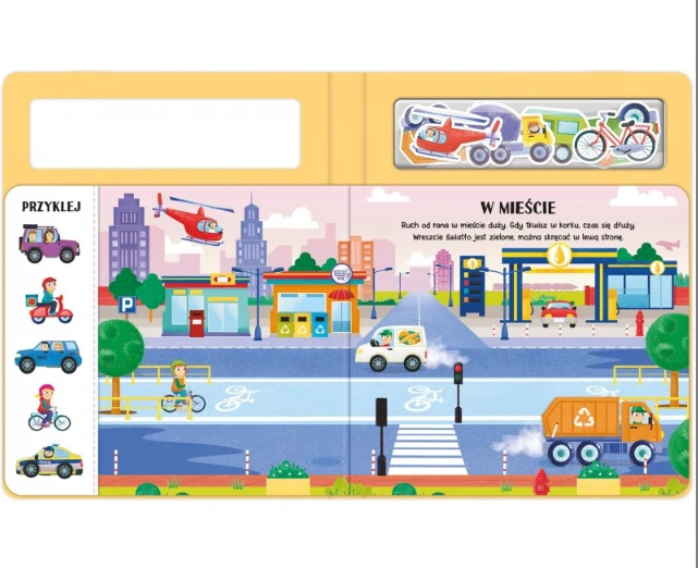Zapraszamy na spotkanie z pojazdami! Dzieci z chęcią uzupełnią scenki, dopasowując magnesowe elementy. Magnesy dobrze przylegają do stron, są bezpieczne i można ich używać wielokrotnie.