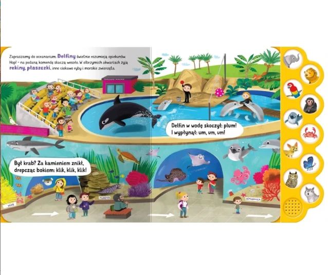 Maluchy z zapałem poznają świat, używając do tego wszystkich zmysłów. Książka dźwiękowa z przyciskami i bogatymi ilustracjami odpowiada ich potrzebom. Bawiąc się nią, dzieci poznają zwierzęta, a powtarzając wierszyki i naśladując odgłosy, rozwijają pamięć, słuch oraz wrażliwość na słowo i obraz.