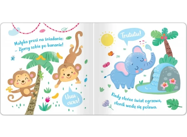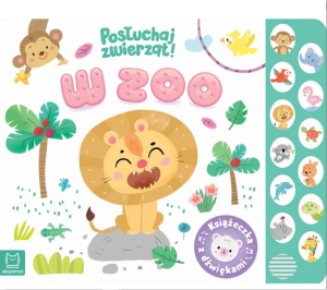 Książeczka z dźwiękami dla małych miłośników zwierząt, a w niej bogate, pastelowe ilustracje odpowiednie dla małych dzieci i krótkie, wpadające w ucho wierszyki o lubianych przez dzieci zwierzakach. Miłą niespodzianką są dołączone dźwięki egzotycznych zwierząt z zoo. Można posłuchać, jakie odgłosy wydają: małpa, słoń, papuga, flaming, lew, żółw, koala, kangur, delfin, wąż, hipopotam i żyrafa. Naciśnij przycisk z obrazkiem, aby włączyć dźwięk. Chcesz wyłączyć? Naciśnij przycisk jeszcze raz. Zabawa z książką rozwija zmysły malucha. Wesołe i łatwe do zapamiętania wierszyki rozwijają pamięć i percepcję dziecka, które wzbogaca również swoją wiedzę o odgłosy wydawane przez zwierzęta egzotyczne. Twarda oprawa i kartonowe karty sprawiają, że książka jest trwała i bezpieczna, a format odpowiedni dla małego dziecka. „Posłuchaj zwierząt!” to książka do czytania, słuchania i oglądania.