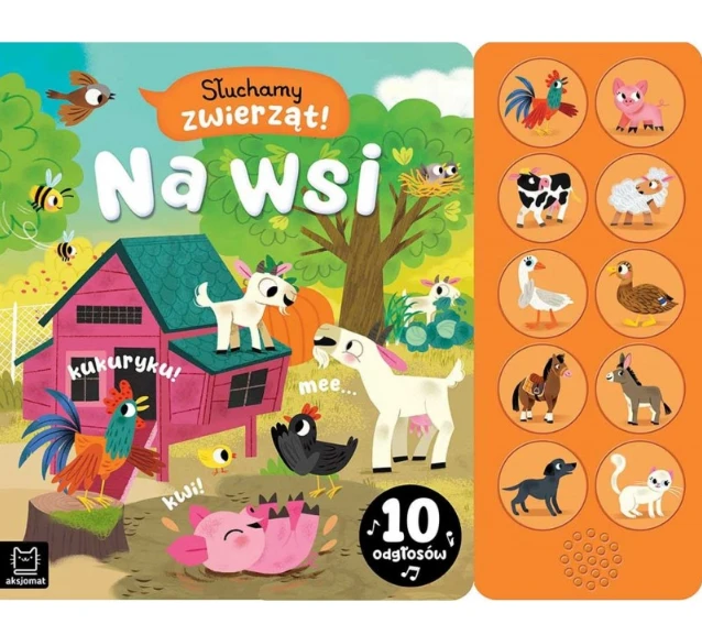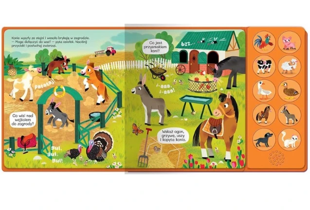 Zapraszamy maluchy do wiejskiej zagrody na spotkanie z sympatycznymi zwierzątkami, które: beczą, muczą, kwaczą, miauczą i wydają inne ciekawe odgłosy. Wystarczy tylko włączyć przycisk na panelu dźwiękowym, by zwierzęta ożyły i dały głos. Starannie przygotowane i przyjemne w odbiorze nagrania oraz piękne ilustracje zachęcają do poznawania zwierząt żyjących na wsi i rozwijają spostrzegawczość maluchów.