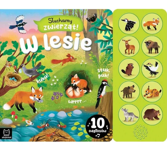 Zapraszamy maluchy na spotkanie z sympatycznymi leśnymi zwierzątkami, które: mruczą, porykują, stukają i wydają inne ciekawe odgłosy. Wystarczy tylko włączyć przycisk na panelu dźwiękowym, by zwierzęta ożyły i dały głos. Starannie przygotowane i przyjemne w odbiorze nagrania oraz piękne ilustracje rozwijają spostrzegawczość maluchów i zachęcają do poznawania zwierząt żyjących w lesie, wśród podmokłych rozlewisk oraz na leśnej polanie. Obrazki w książce zachęcają również do opowiadania, opisywania, wskazywania szczegółów i ich liczenia. Do książki dołączony jest panel dźwiękowy z głośniczkiem i przyciskami. Dzieci z łatwością uruchamiają realistyczne nagrania zwierząt. Tym samym uczą się samodzielności i rozwijają motorykę małą. Gdy nagrania już się znudzą, można zablokować ich odtwarzanie.
