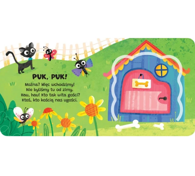 Aktywizująca książeczka dla najmłodszych. Zabawa tą książką polega na otwieraniu okienek, w których kryją się zwierzęta: piesek, owce, królik, kurczątko, krowa.