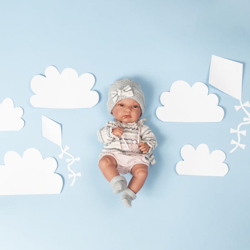 Hiszpańska dziewczynka ubrana jest w krótkie spodenki przypominające majteczki i bluzeczkę na długi rękaw. Koszulkę w modne paski zdobią rozkloszowane rękawy oraz kołnierzyk z falbanką. Koszula jest zapinana z tyłu na rzepę. Do zestawu dołączona jest wsuwana czapeczka z kokardką oraz skarpetki. Wszystkie ciuszki lalki można zdjąć, aby młoda mama nabrała wprawy w przebieraniu pociechy. W ten sposób codzienny obowiązek, który często stanowi spore wyzwanie, może stać się przyjemnością :)