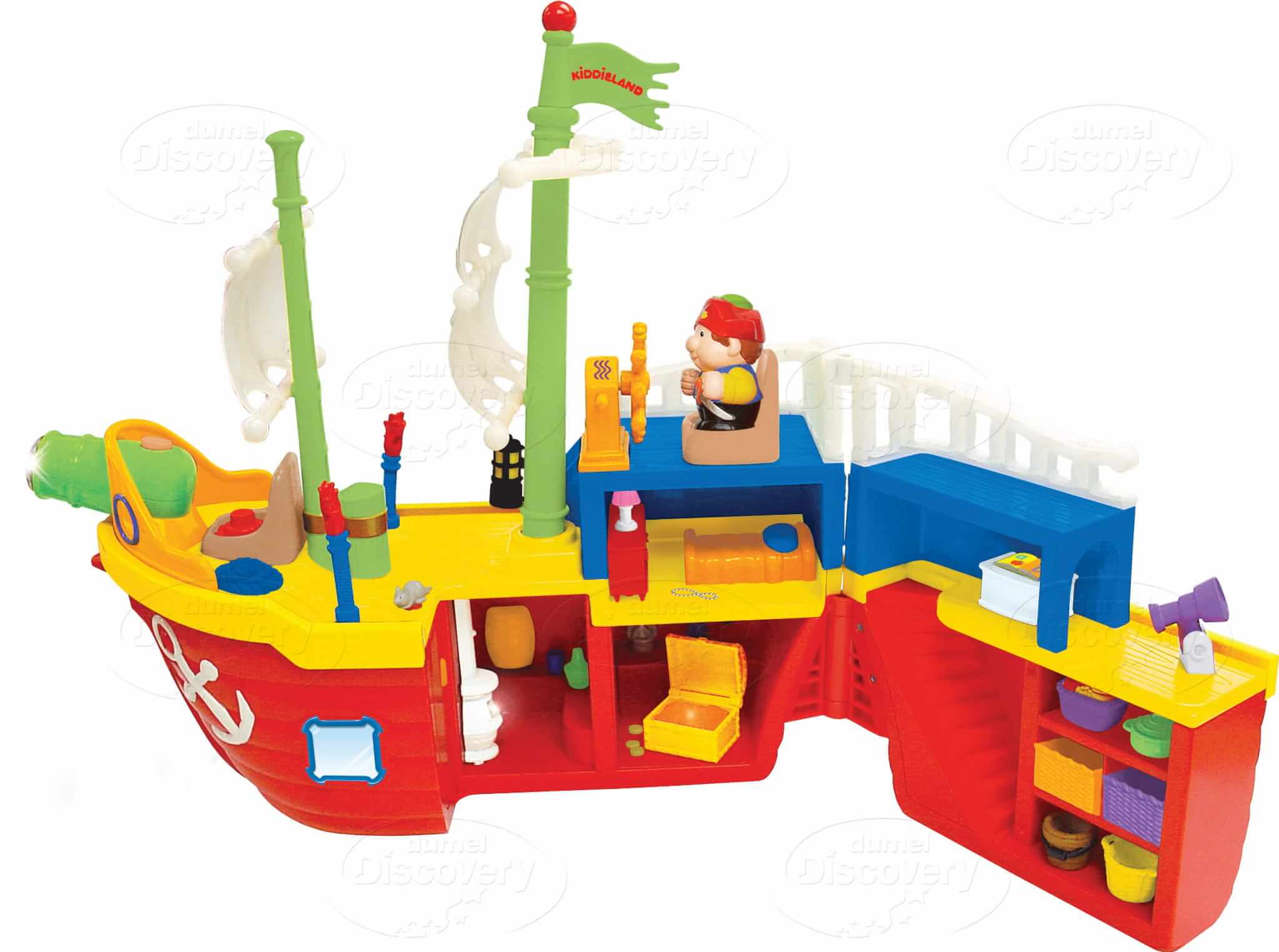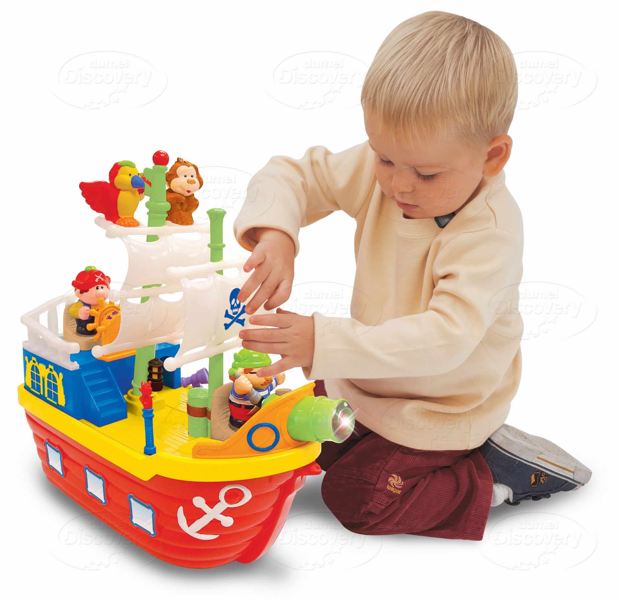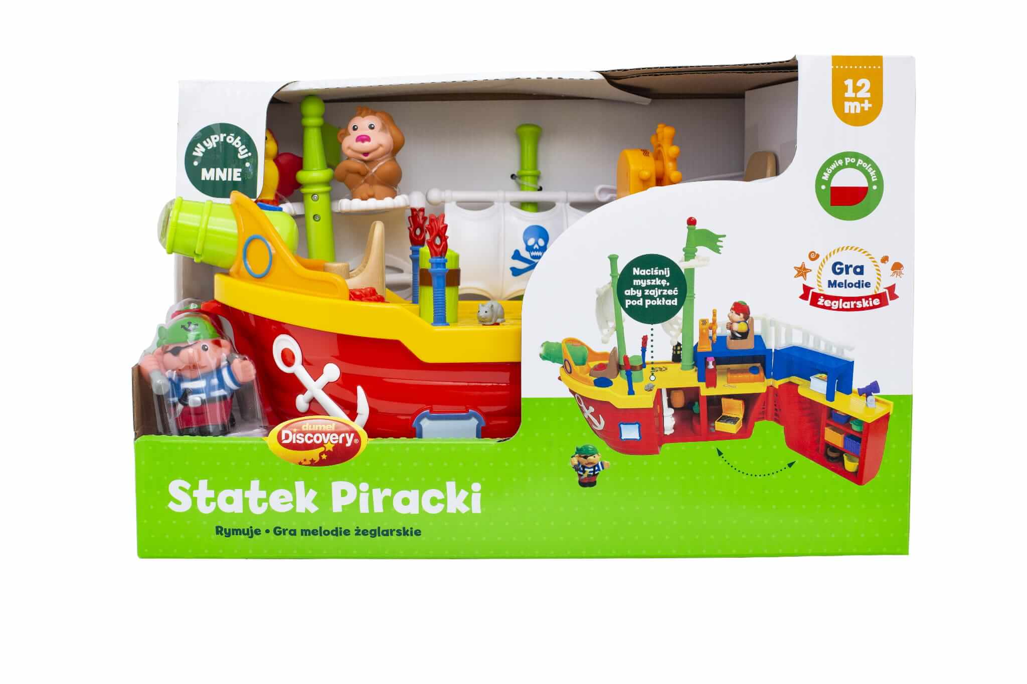 Poznaj ulepszoną wersję statku pirackiego! Prawie każdy element zabawki kryje jakieś niespodzianki. Naciskając na piratów znajdujących się na pokładzie, usłyszymy zabawne rymowanki oraz prawdziwe melodie żeglarskie. Po naciśnięciu na myszkę znajdującą się na pokładzie, usłyszymy jej charakterystyczny dźwięk, a po ponownym naciśnięciu słychać wesołą żeglarską melodię. Dodatkowo po przekręceniu myszki maluch ma możliwość zajrzenia po pokład! W jednym z pomieszczeń znajduje się skrzynia ze skarbem! Kiedy otworzymy skrzynię i naciśniemy na kosztowności, słychać rymowankę i wesołą melodię żeglarską. Odkryj również wiele innych funkcji jakie kryje Statek Piracki. Zabawka pobudza wyobraźnię oraz rozwija kreatywność.
