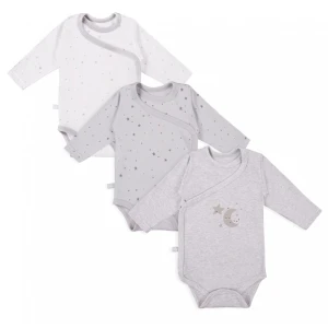 3-pak body kopertowe w gwiazdki z kolekcji "Tiny" uszyte z miękkiej i przyjemnej w dotyku elastycznej dzianiny bawełnianej. Wykonane z cieńszej niż nasze standardowe kolekcje bawełny. W 3-paku znajdują się 3 sztuki kopertowych body niemowlęcych. Wykończone są miękką lamówką. Wielopaki są bardzo wygodne podczas kompletowania wyprawki dla maluszka. Do body idealnie sprawdzą się półśpiochy z tej samej kolekcji. Rękawki w bodach są podwinięte. Body niemowlęce idealnie sprawdzają się w pierwszych miesiącach życia dziecka i należą do najczęściej wybieranego asortymentu przez mamy.