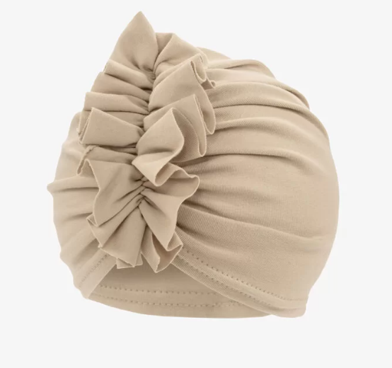tylowa i wygodna czapka typu Kakadu / turban dla dziewczynki, wykonana z miękkiej i elastycznej bawełny. Doskonale dopasowuje się do główki, nie uciskając jej, a ozdobne marszczenie z przodu dodają elegancji i uroku. Idealna na co dzień oraz na wyjątkowe okazje, świetnie komponuje się z dziewczęcymi stylizacjami.