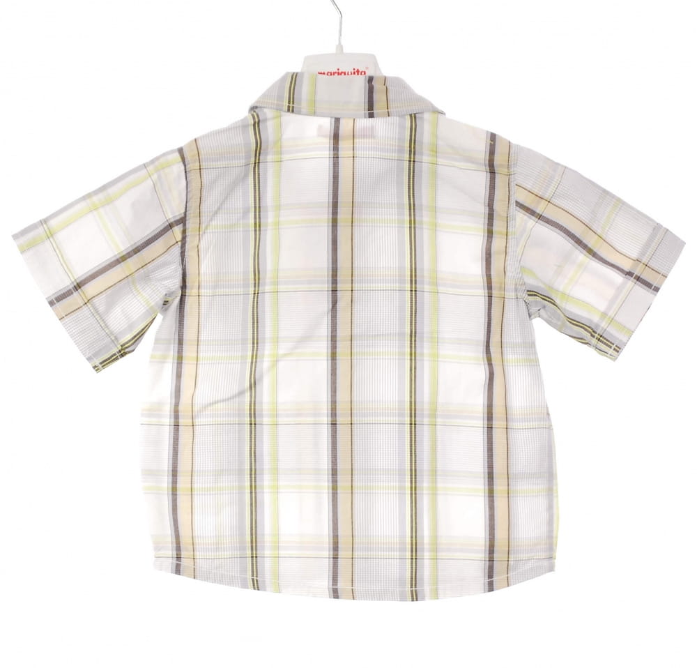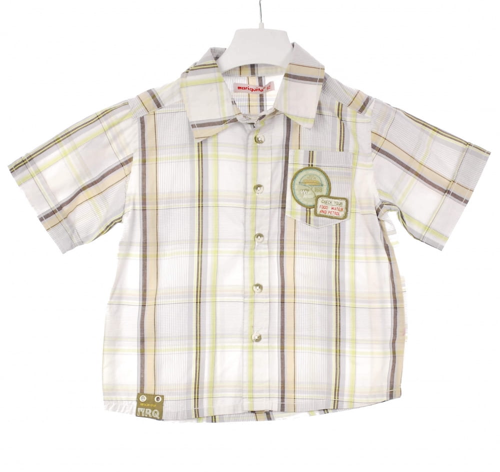 Koszula z krótkim rękawem dla chłopca . Kołnierzyk koszulowy. Zapięcie z przodu na guziki. Ubranko wykonane ze 100% bawełny. Motyw w kratę . Ozdobne naszywki na kieszonce.