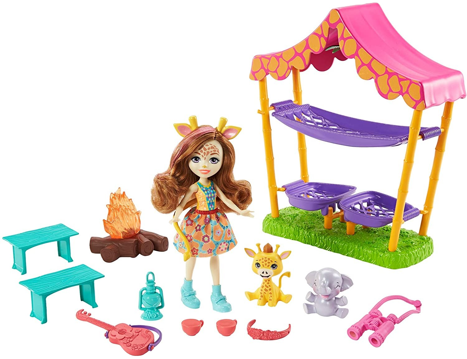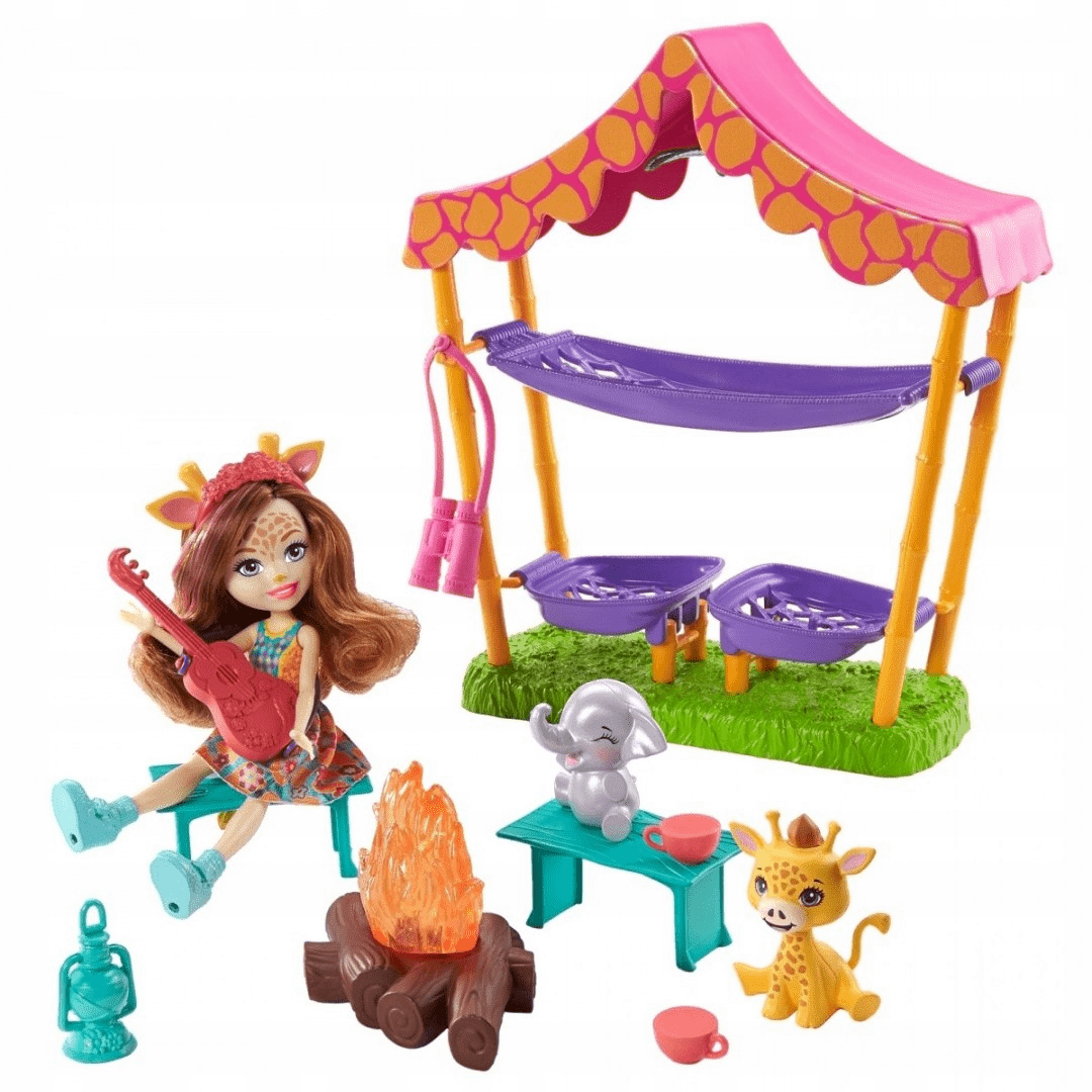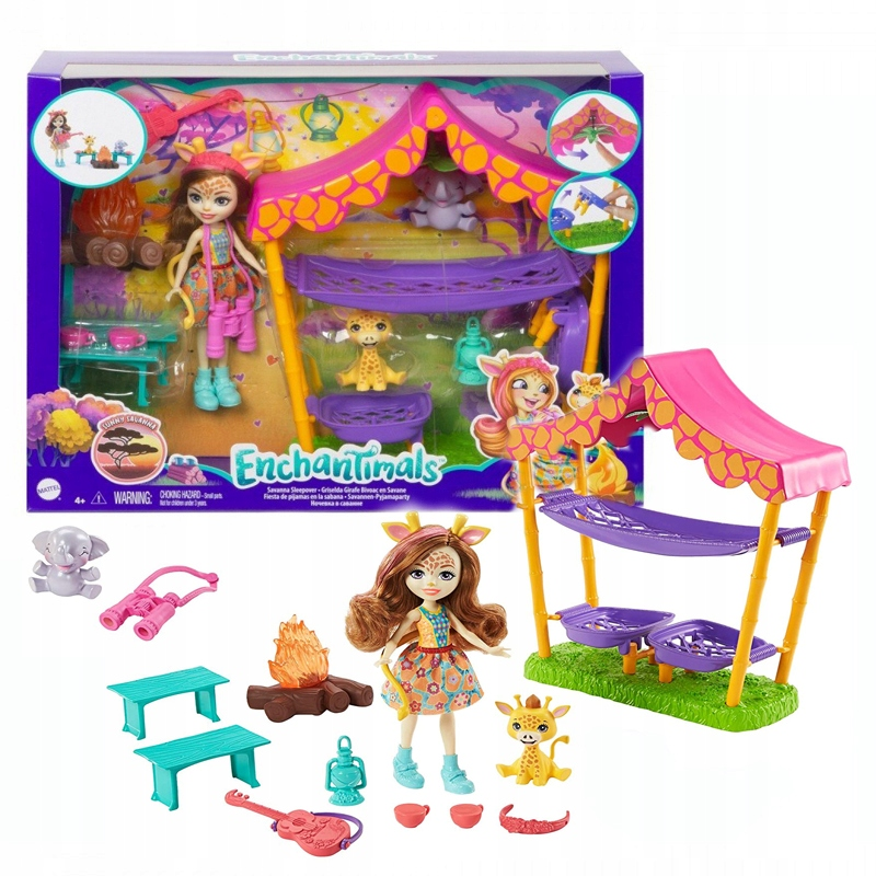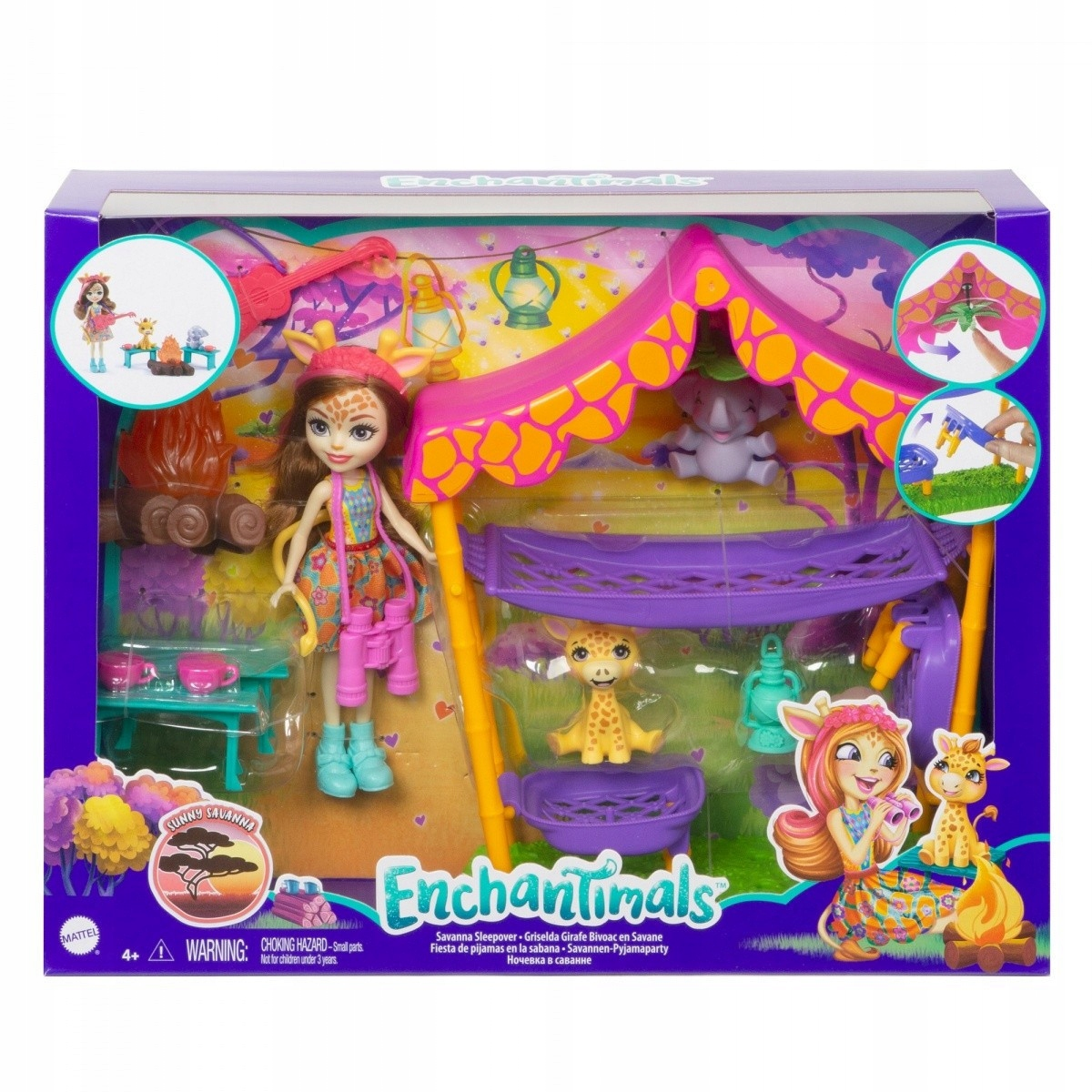 Przemierzaj Promienną Sawannę z lalką Griseldą Giraffe i jej zwierzęcymi przyjaciółmi! Zestaw do zabawy Enchantimals Biwak na sawannie jest pełen elementów inspirujących do opowiadania własnych historyjek. Przysiądź na ławeczce przy ognisku, aby spędzić wesoło czas w stylu Enchantimals dzięki takim akcesoriom jak gitara, kubeczki, latarenka i nie tylko. A potem połóż się w namiocie i śnij słodko o przygodach na sawannie.