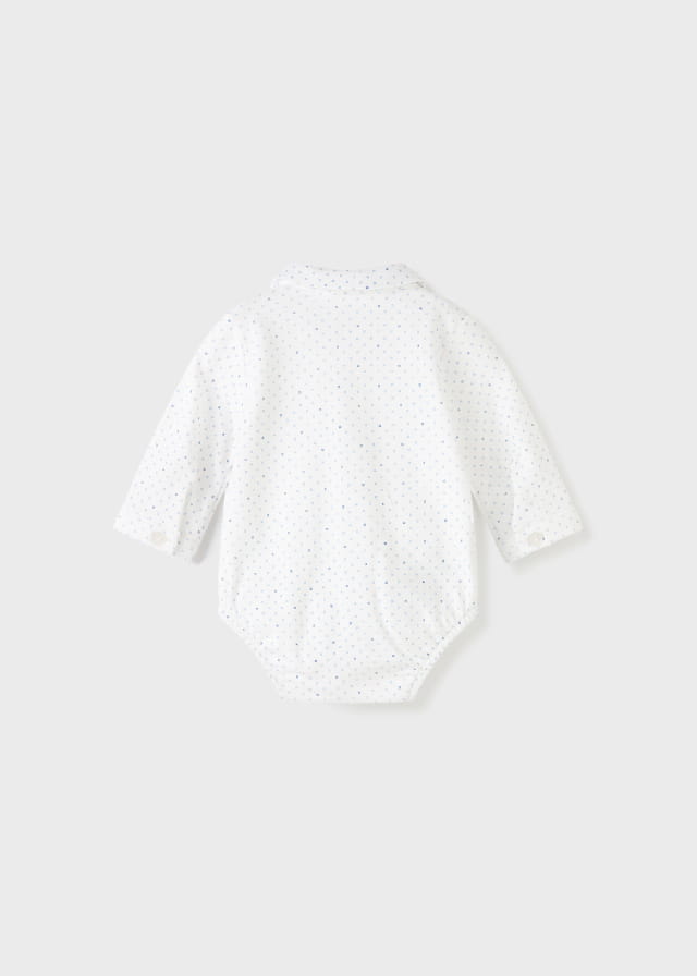 Ubranko ECOFRIENDS 100% ekologiczna bawełna. Body z długim rękawem dla noworodka chłopca 0 do 18 miesięcy. Kołnierzyk koszulowy. Zapięcie na zatrzaski w kroku. Zapięcie z przodu na guziki.