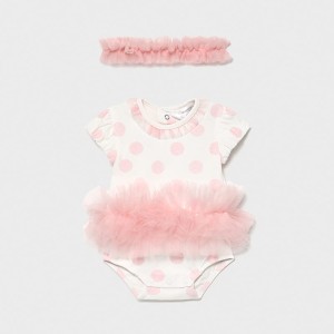 Śliczne body Mayoral w kremowym kolorze w różowe kropki, z ozdobnymi tiulowymi falbankami, zapinane z tyłu i w kroku na napy. Do kompletu różowa, tiulowa opaska.