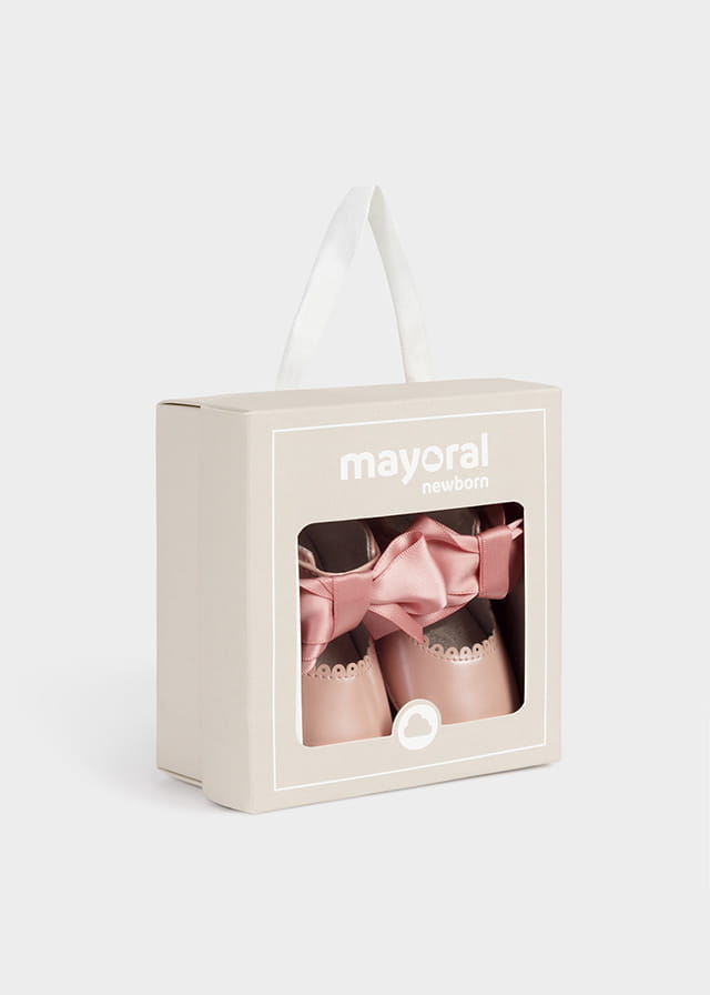 Buty typu pantofelki dla noworodka dziewczynki 0 do 18 miesięcy, w klasycznym i ponadczasowym stylu do eleganckich zestawów ubranek. Buty z wyściółką wewnętrzną i podeszwą wewnętrzną z oddychającej bawełny. Zewnętrzna warstwa lakierowana. Zapięcie na regulowany rzep, co gwarantuje doskonałe przyleganie do stopy. Ozdoby: ozdobne wiązanie. Artykuł ten jest pakowany w pudełeczko z linii Newborn, idealnie pasujące na specjalne okazje.