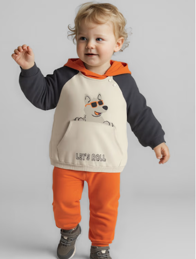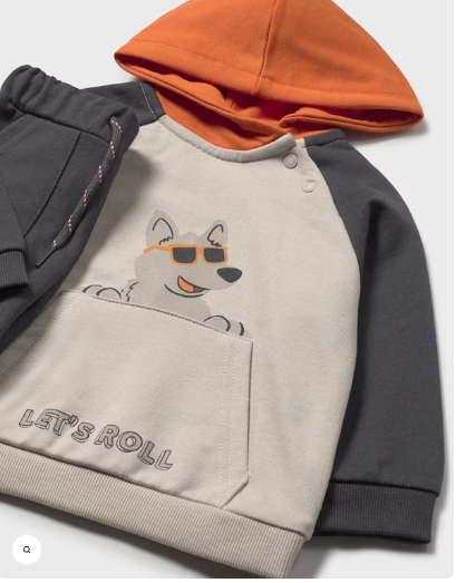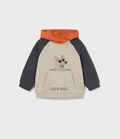 Bluza dla niemowlęcia z kapturem. Zapięcie na zatrzaski na ramieniu ułatwiające zakładanie ubrania. Z przodu funkcjonalna kieszeń. Ozdoby: Sitodruk (print).