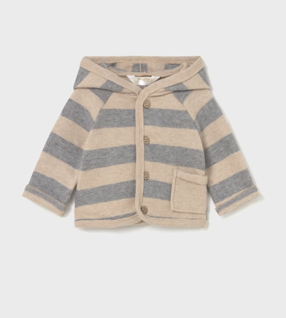 Bluza dla noworodka. Kołnierz z kapturem. Zapięcie z przodu na guziki. Z przodu funkcjonalna kieszeń. Motyw w paski.