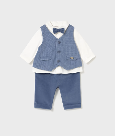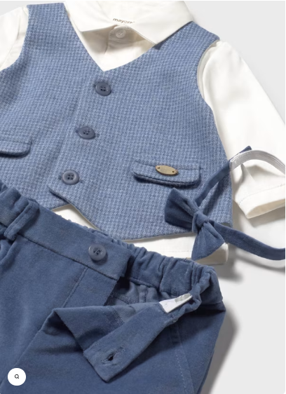Elegancki komplet do chrztu lub na inne wielkie okazje składa się z 3 części. To koszula z kołnierzykiem, z wszytą kamizelką oraz muszką i spodnie z mankietem. Całość bardzo mięciutka i wygodna.