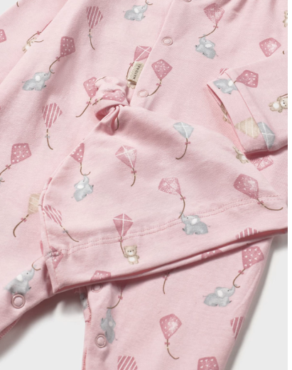 Pajacyk niemowlęcy ze stópkami, rozpinany na całej długości oraz w kroku. Rozmiary 80 i 86 posiadają antypoślizgową podeszwę. W zestawie występuje urocza czapeczka z tej samej dzianiny z węzełkiem na czubku głowy.