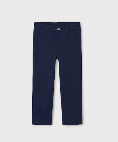 Chinosy slim fit dla chłopca w kolorze granatowym. Zapięcie na zamek i guzik. Regulowana gumka w pasie dla lepszego dopasowania. Wygodna i trwała tkanina z serży. Ze względu na wymogi bezpieczeństwa, mniejsze rozmiary (2-5 lat) posiadają imitację rozporka, bez zamka.