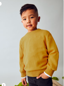 Sweter z długim rękawem dla chłopca w kolorze musztardowym. Okrągły dekolt. Dół, mankiety i dekolt z elastycznej dzianiny dla lepszego dopasowania.