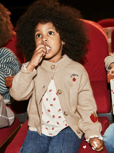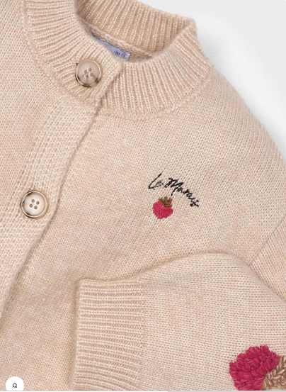 Mięciutki sweter dla dziewczynki zapinany na guziki z okrągłym dekoltem w kolorze beżowym z wyhaftowanymi truskawkami. Zwiera poliester z recyklingu.
