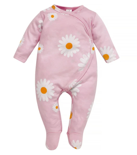 Wygodny pajac z wysokiej jakości bawełny różowy w stokrotki.