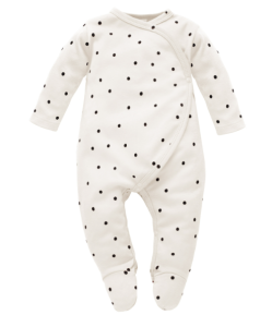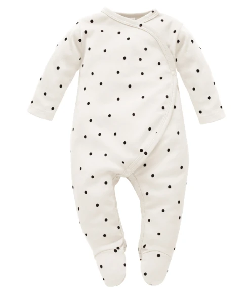 Wygodny pajac z wysokiej jakości bawełny w kolorze ecru w czarne groszki.