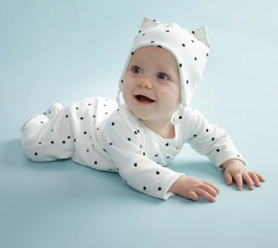 Wygodny pajac z wysokiej jakości bawełny w kolorze ecru w czarne groszki. Pajac rozpinany jest kopertowo, dzięki czemu łatwo ubrać lub przewinąć dziecko. To idealne rozwiązanie dla młodych, początkujących rodziców. Niezbędny element wyprawki dla noworodka. Zatrzaski wykonano z antyalergicznego tworzywa bez dodatku niklu. W kroku wszyliśmy klin, który zapewnia maluszkowi swobodę ruchu podczas codziennych aktywności. Specjalne gumki umieszczone nad piętkami uniemożliwiają zsuwanie się ich np. podczas zabawy. Pajacyk Lovely Day sprawdzi się na co dzień, a także na noc jako piżamka.