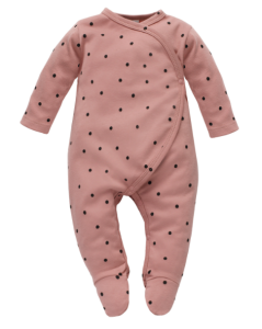 Wygodny pajac z wysokiej jakości bawełny w kolorze różowym w czarne groszki.