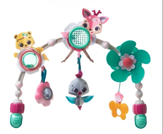 Na łuku umieszczone są różnorodne zabawki, które zostały zaprojektowane z myślą o rozwoju różnych zmysłów oraz umiejętności motorycznych.