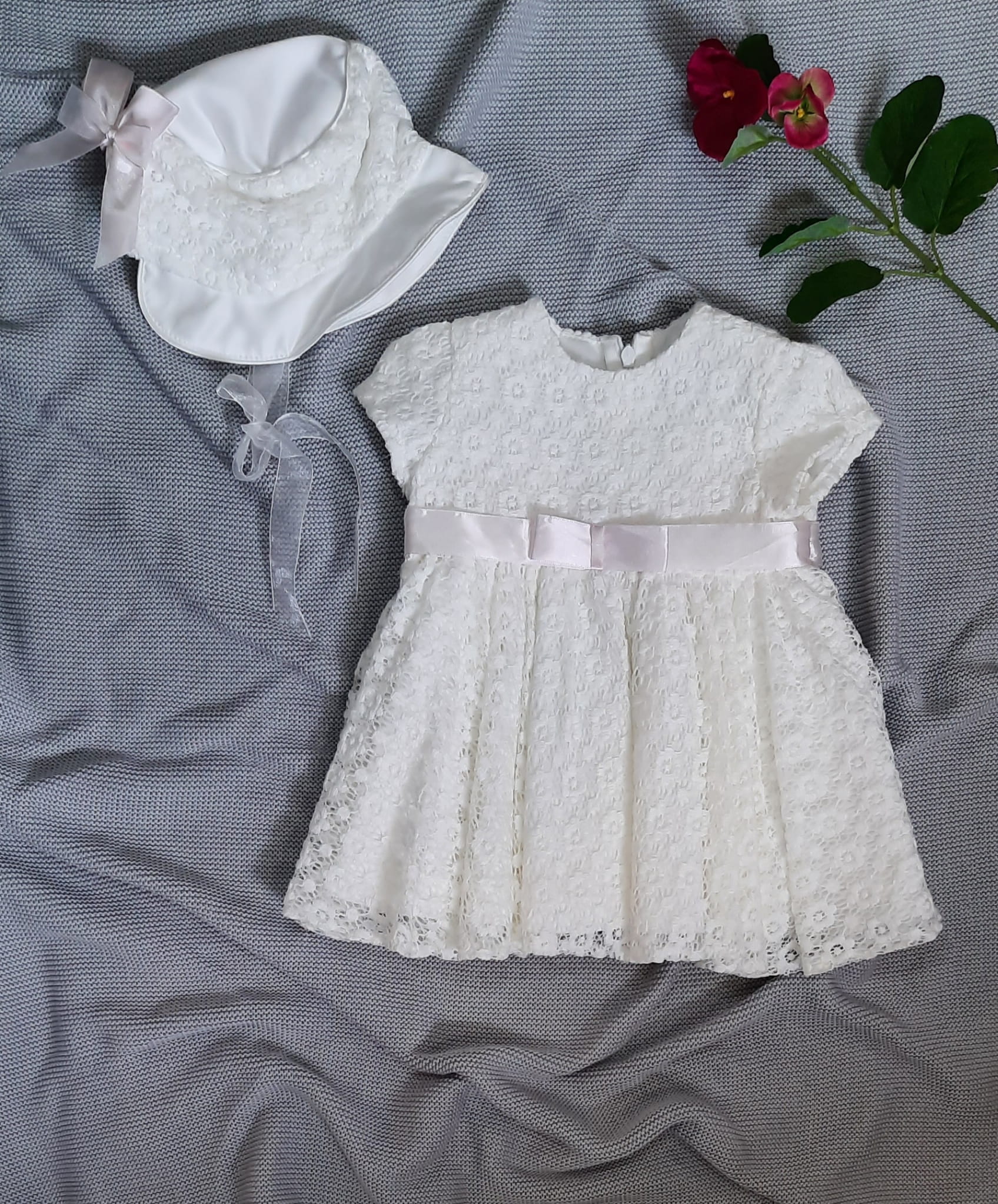 Koronkowa sukienka z krótkim rękawem plus czapka. Doskonale nadaje się na uroczystość chrzścin.